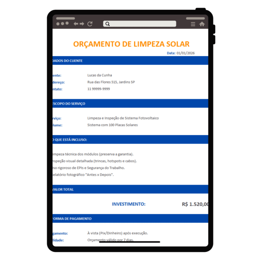 - Velocidade: Gere uma proposta em PDF pronta para enviar no WhatsApp.